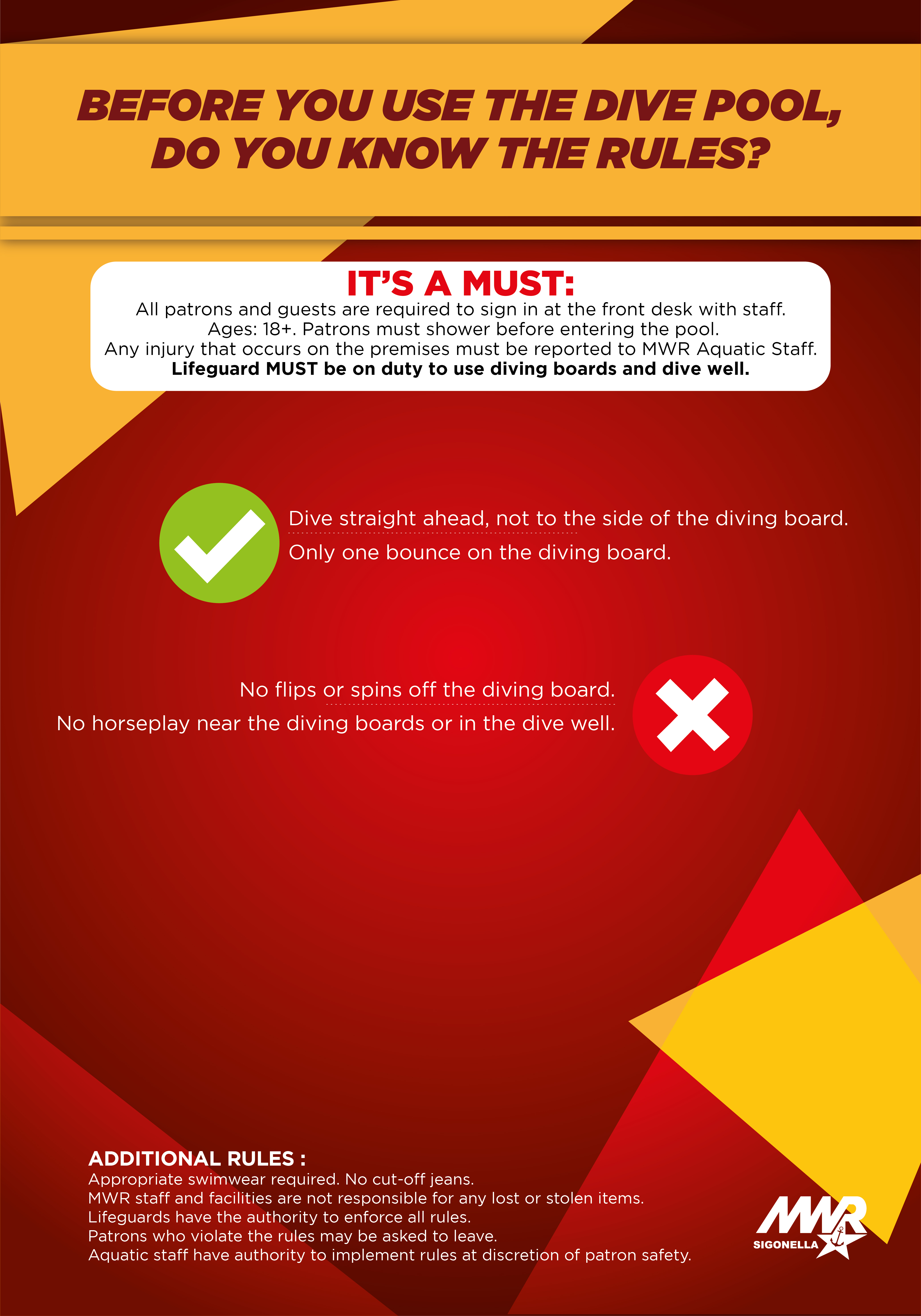 Do you have a special request? Please contact the Aquatics Director for more information at bridget.a.doughty.naf@us.navy.mil.